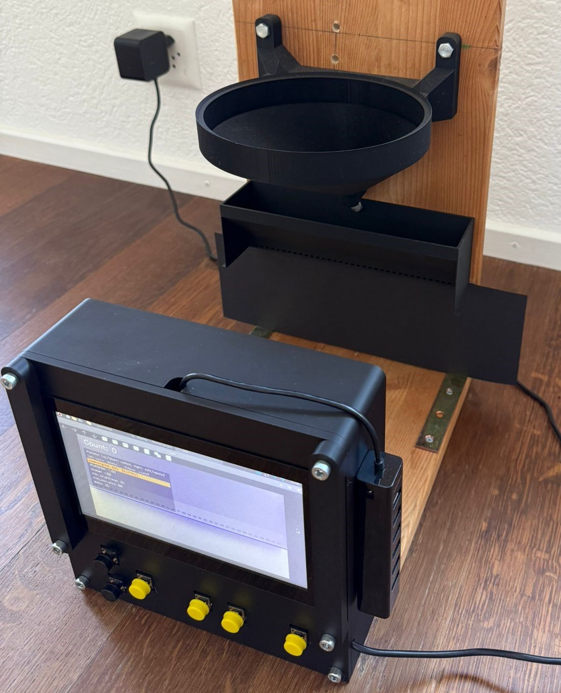 The purpose of the first circular funnel is to facilitate the loading of larvae into the second funnel, which in turn forces them to spread out horizontally along the back wall and makes them fall out through holes on the side the funnel one after another. The falling larvae are filmed by a camera located at the back wall of the 3D printed electronics box. Then the LCM MK1 python program, running on a Raspberry Pi 5, uses frame differencing to count the larvae falling through the camera’s field of view.