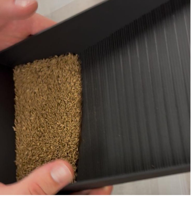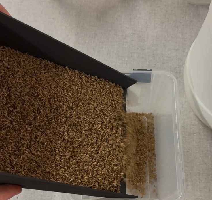 Repeat the process if there are still large chunks of chicken feed visible in the larvae mix (2–3 times bigger than the size of the larvae).