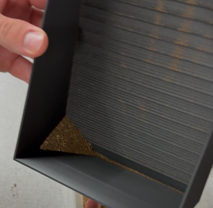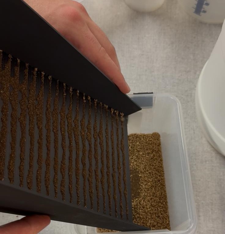 - Rotate the the gold pan back upwards to a steep angle and knock it on the back so the frass collects at the back side. Then knock from the side to move the frass into a corner. Pour the separated frass into the frass collection container (Smaller larvae may remain in the frass and should be added back into the chicken feed larvae boxes for transfer and counting on a later day).